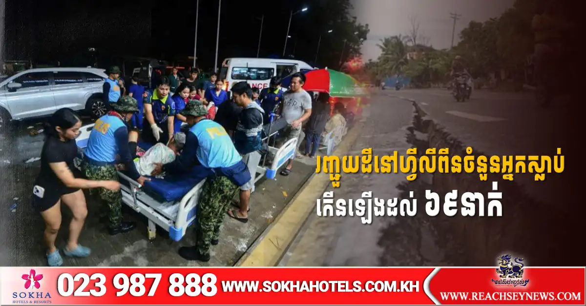 ម៉ានីល៖ ចំនួនអ្នកស្លាប់ដោយសារគ្រោះរញ្ជួយដីដ៏ខ្លាំងមួយនៅភាគកណ្តាលប្រទេសហ្វីលីពីន បានកើនឡើងដល់ ៦៩នាក់ហើយកាលពីថ្ងៃពុធ ទី១ ខែតុលា ដោយអ្នករងរបួសជាច្រើននាក់បានទៅមន្ទីរពេទ្យនៅលើកោះ Cebu ខណៈដែលកម្មករជាច្រើនបានយកថង់ខ្ចប់សាកសពរាប់សិប។