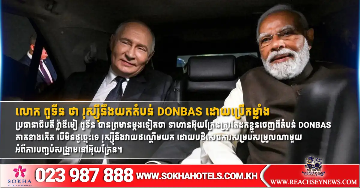 ប្រធានាធិបតី វ្ល៉ាឌីមៀ ពូទីន បានព្រមានម្តងទៀតថា ទាហានអ៊ុយក្រែនត្រូវតែដកខ្លួនចេញពីតំបន់ Donbas ភាគខាងកើត បើមិនដូច្នេះទេ រុស្ស៊ីនឹងវាយដណ្តើមយក ដោយបដិសេធការសម្របសម្រួលណាមួយ អំពីការបញ្ចប់សង្រ្គាមនៅអ៊ុយក្រែន។