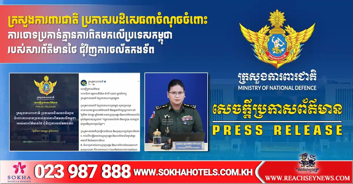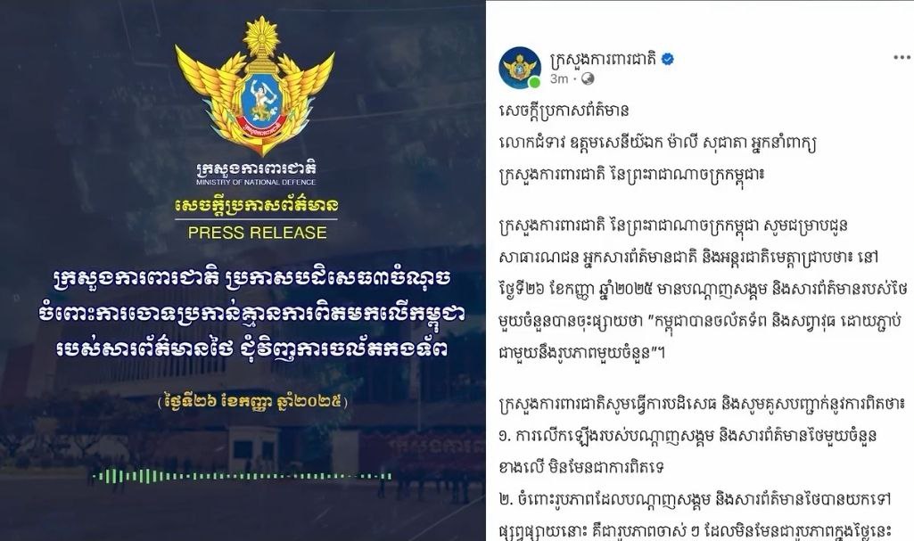 យោងតាមសេចក្ដីប្រកាសព័ត៌មាន របស់ក្រសួងការពារជាតិ នៅរសៀលថ្ងៃទី២៦ ខែកញ្ញា ឆ្នាំ២០២៥នេះ ក្រសួងការពារជាតិបានប្រកាសបដិសេដ និងគូសបញ្ជាក់នូវការពិតចំនួន៣ចំណុច ចំពោះការចោទប្រកាន់នេះថា៖ ១. ការលើកឡើងរបស់បណ្តាញសង្គម និងសារព័ត៌មានថៃមួយចំនួនខាងលើ មិនមែនជាការពិតទេ។ ២. ចំពោះរូបភាពដែលបណ្តាញសង្គម និងសារព័ត៌មានថៃបានយកទៅផ្សព្វផ្សាយនោះ គឺជារូបភាពចាស់ ៗ ដែលមិនមែនជារូបភាពក្នុងថ្ងៃនេះនោះទេ និងទី៣. កងកម្លាំងរបស់កម្ពុជាមិនបានធ្វើសកម្មភាពបង្កហេតុ ឬធ្វើសកម្មភាពណាមួយដែលរំលោភបំពានលើ កិច្ចព្រមព្រៀងបទឈប់បាញ់ ដូចការលើកឡើងរបស់បណ្តាញសង្គម និងសារព័ត៌មានថៃនោះឡើយ