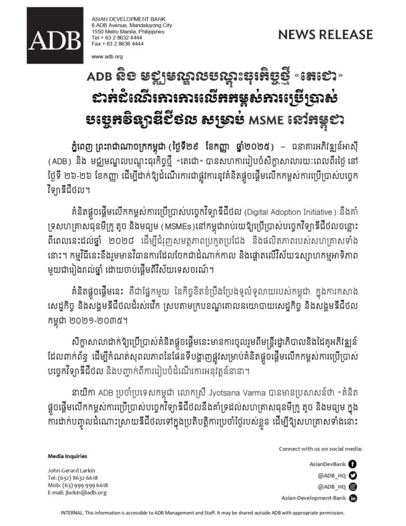ភ្នំពេញ ៖ ធនាគារអភិវឌ្ឍន៍អាស៊ី (ADB) និងមជ្ឈមណ្ឌលបណ្តុះធុរកិច្ចថ្មី «តេជោ» បានសហការរៀបចំសិក្ខាសាលារយៈពេលពីរថ្ងៃ នៅថ្ងៃទី២៦-២៧ ខែកញ្ញា ឆ្នាំ២០២៥ ដើម្បីដាក់ឱ្យដំណើរការជាផ្លូវការ នូវគំនិតផ្តួចផ្តើមលើកកម្ពស់ការប្រើប្រាស់បច្ចេកវិទ្យាឌីជីថល។