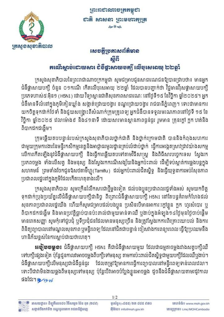 យោងតាមសេចក្ដីប្រកាសព័ត៌មាន របស់ក្រសួងសុខាភិបាល នៅថ្ងៃទី១៥ វិច្ឆិកា ថា មានអ្នក ជំងឺផ្តាសាយបក្សី ចំនួន ០១ករណី កើតលើបុរសអាយុ ២២ឆ្នាំ ដែលបានបញ្ជាក់ថា វិជ្ជមានវីរុសផ្តាសាយបក្សី ប្រភេទហាស់៥ អ៊ុន១ (H5N1) ដោយ វិទ្យាស្ថានជាតិសុខភាពសាធារណៈ នៅថ្ងៃទី១៥ ខែវិច្ឆិកា ឆ្នាំ២០២៥។ អ្នក ជំងឺមានទីលំនៅក្នុងភូមិគៀនឃ្លាំង សង្កាត់ជ្រោយចង្វារ ខណ្ឌជ្រោយចង្វារ រាជធានីភ្នំពេញ។ ទោះជាមានការ យកចិត្តទុកដាក់ថែទាំ និងជួយសង្គ្រោះពីសំណាក់ក្រុមគ្រូពេទ្យ អ្នកជំងឺបានទទួលមរណភាពនៅថ្ងៃទី ១៥ ខែ វិច្ឆិកា ឆ្នាំ២០២៥ វេលាម៉ោង៩ និង៤១នាទី ដោយសារមានស្ថានភាពធ្ងន់ធ្ងរ រួមមាន គ្រុនក្តៅ ក្អក ហត់និង ពិបាកដកដង្ហើម។