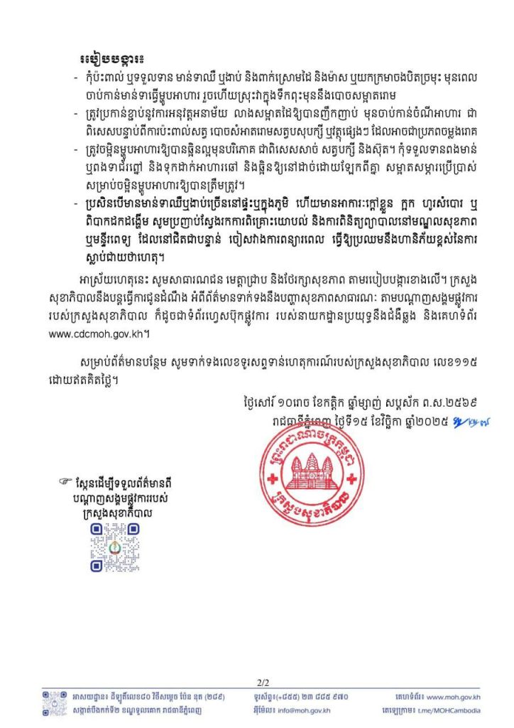 ក្រសួងសុខាភិបាល បន្ដថា «សូមជម្រាបដល់បងប្អូន ប្រសិនបើមានអាការៈក្តៅខ្លួន ក្អក ហូរសំបោរ ឬ ពិបាកដកដង្ហើម និងមានប្រវត្តិធ្លាប់បានប៉ះពាល់ជាមួយមាន់ទាឈឺ ឬងាប់ក្នុងអំឡុង១៤ថ្ងៃមុនថ្ងៃចាប់ផ្តើម មានរោគសញ្ញា សូមកុំទៅជួបជុំ ឬទីប្រជុំជនដែលមានមនុស្សច្រើន និងត្រូវស្វែងរកការពិគ្រោះយោបល់ និងការ ពិនិត្យព្យាបាលនៅមណ្ឌលសុខភាព ឬមន្ទីរពេទ្យ ដែលនៅជិតជាបន្ទាន់ ចៀសវាងការពន្យារពេល ធ្វើឱ្យប្រឈមនឹង ហានិភ័យខ្ពស់នៃការស្លាប់ជាយថាហេតុ»៕
