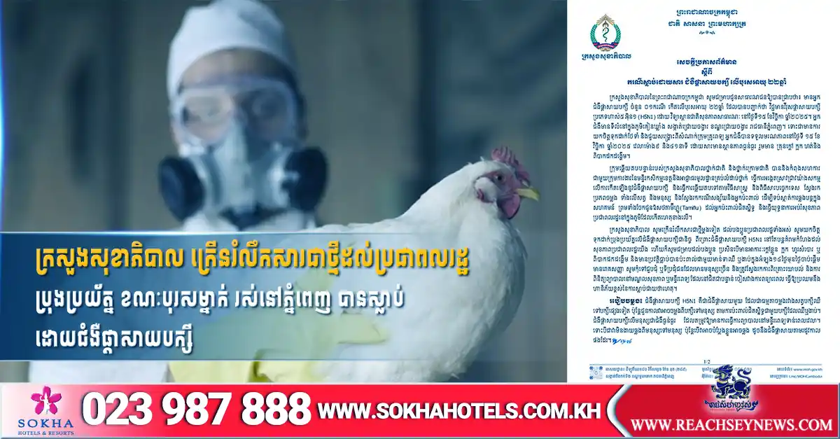 ភ្នំពេញ ៖ ក្រសួងសុខាភិបាល បានក្រើនរំលឹកសារជាថ្មីម្តងទៀតដល់ប្រជាពលរដ្ឋទាំងអស់ ប្រុងប្រយ័ត្នលើជំងឺផ្តាសាយបក្សីជានិច្ច ខណៈមានករណីស្លាប់ដោយសារជំងឺផ្តាសាយបក្សី លើបុរសអាយុ ២២ឆ្នាំម្នាក់ រស់នៅខណ្ឌជ្រោយចង្វារ រាជធានីភ្នំពេញ។
