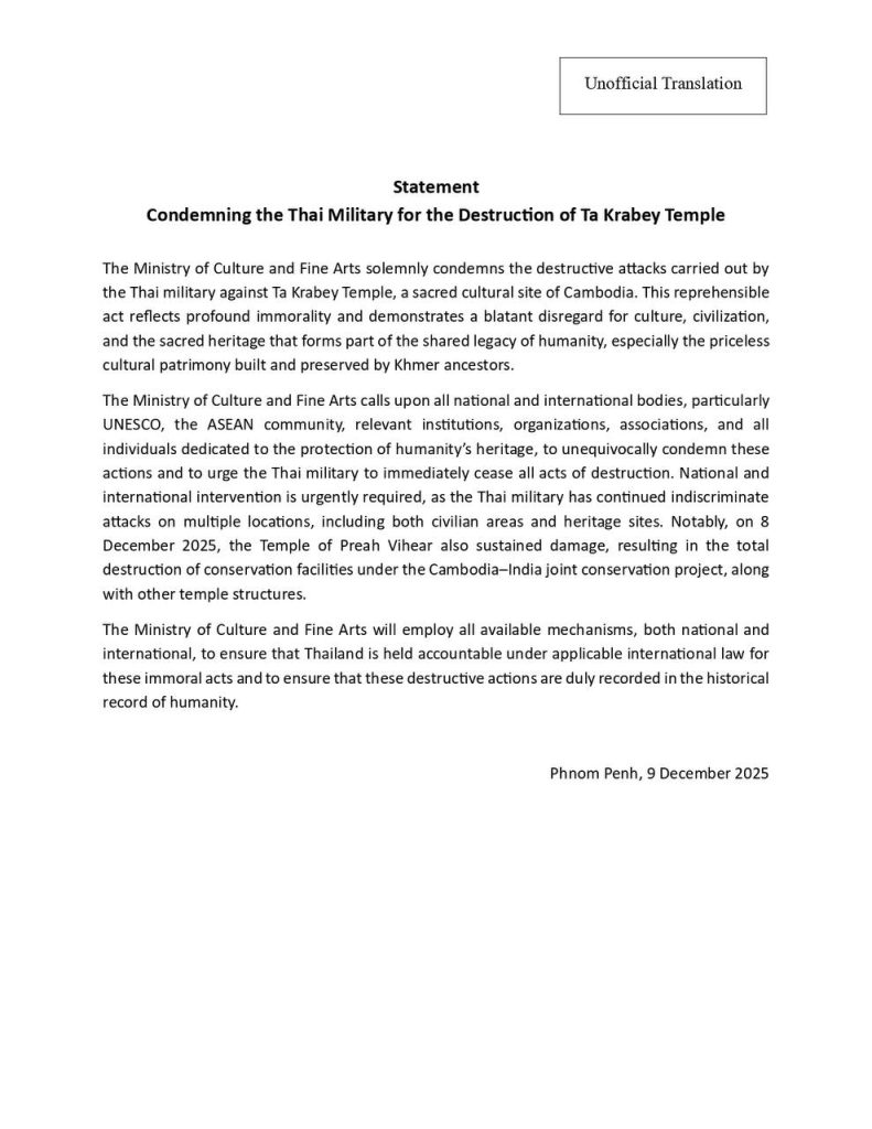 ក្រសួងវប្បធម៌ និងវិចិត្រសិល្បៈ បានគូសបញ្ជាក់ថា «សូមអំពាវនាវដល់គ្រប់មជ្ឈដ្ឋានជាតិ អន្តរជាតិ ជាពិសេសអង្គការយូណេស្កូ សហគមន៍អាស៊ាន និងបណ្តាស្ថាប័នពាក់ព័ន្ធ អង្គការសមាគម និងបុគ្គលគ្រប់ៗរូបដែលស្រឡាញ់ការពារបេតិកភណ្ឌនៃ មនុស្សជាតិ សូមចូលរួមថ្កោលទោសយ៉ាងខ្លាំងក្លាបំផុត និងជំរុញយោធាថៃឱ្យបញ្ឈប់ជាបន្ទាន់នូវសកម្មភាពបំផ្លិចបំផ្លាញនេះ»៕