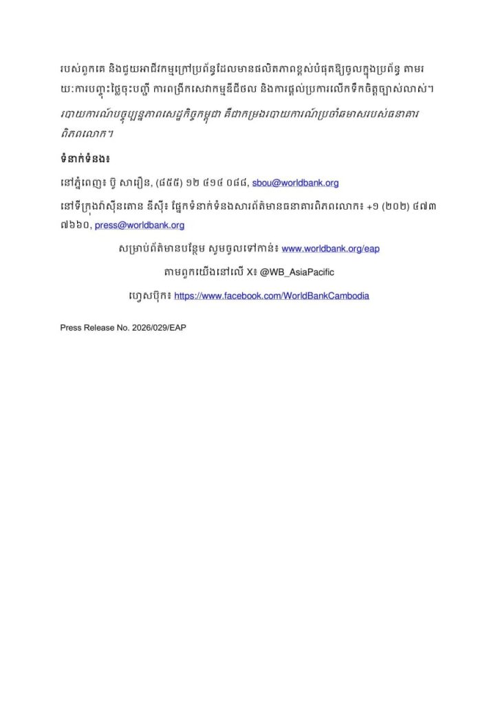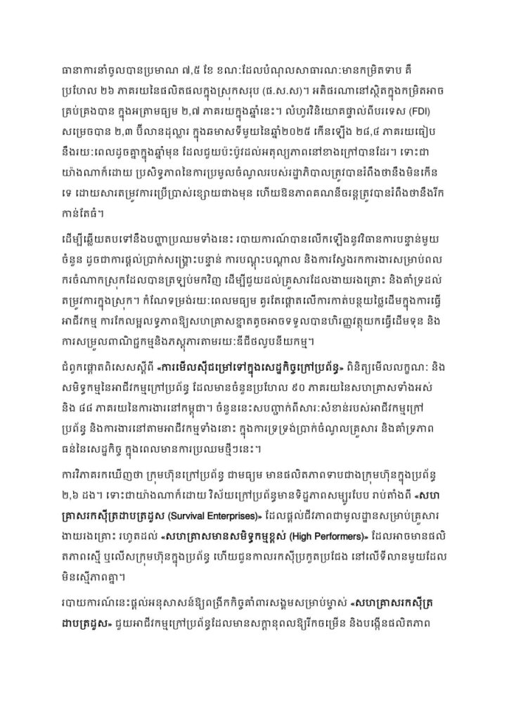 របាយការណ៍បច្ចុប្បន្នភាពសេដ្ឋកិច្ចកម្ពុជា សម្រាប់ខែធ្នូ ឆ្នាំ២០២៥ ដែលមានចំណងជើងថា «ជម្នះការប្រឈម (Coping with Shocks)» ធ្វើការពិនិត្យមើលថាតើ ការធ្លាក់ចុះ នៃវិស័យអចលនទ្រព្យ ការរំខាននៅតាមព្រំដែន និងការរឹតបន្តឹងពាណិជ្ជកម្មថ្មីៗ កំពុងមានសម្ពាធដូចម្តេចខ្លះទៅលើកំណើនសេដ្ឋកិច្ច។ ការធ្លាក់ចុះនៃទីផ្សារអចលនទ្រព្យ បានធ្វើឱ្យតម្រូវការក្នុងស្រុក និងសកម្មភាពសំណង់ធ្លាក់ចុះ ខណៈដែលភាពតានតឹងនៅតាមព្រំដែនបានបង្អាក់សកម្មភាពក្នុងទីផ្សារការងារ និងក្នុងវិស័យទេសចរណ៍។