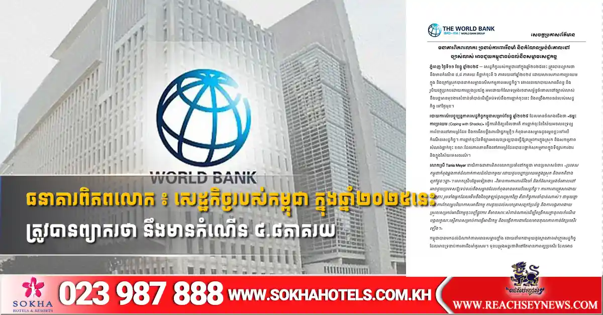 ភ្នំពេញ ៖ សេដ្ឋកិច្ចរបស់កម្ពុជា នៅក្នុងឆ្នាំ២០២៥នេះ ត្រូវបានព្យាករថា នឹងមានកំណើន៤.៨ ភាគរយ គឺធ្លាក់ចុះពី ៦ ភាគរយនៅឆ្នាំ២០២៤ ដោយសារសភាពការប្រឈមក្នុង និងក្រៅស្រុកបានដាក់សម្ពាធលើសកម្មភាពសេដ្ឋកិច្ច។