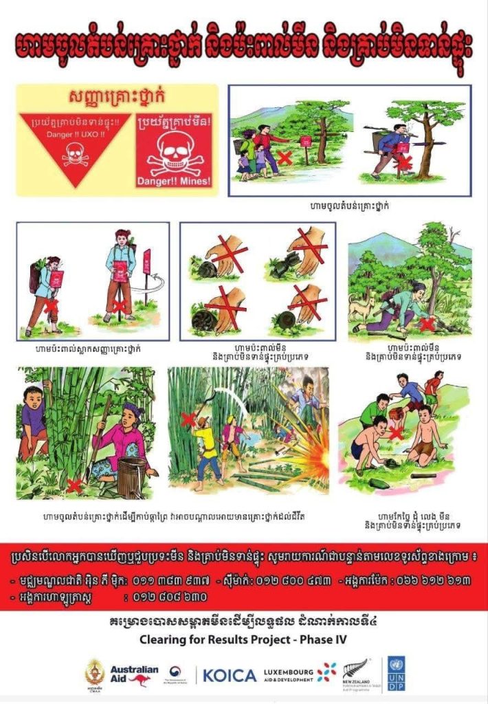 នៅពេលប្រទៈឃើញមីន គ្រាប់មិនទាន់ផ្ទុះ គ្រាប់បែកចង្កោម និងវត្ថុចំលែកសង្ស័យជាគ្រាប់ សូមកុំប៉ះពាល់ កែច្នៃ គប់ ដុំ ឬចល័តទៅទីណាមួយ គ្រាប់ទាំងនោះនឹងធ្វើឱ្យរបួស ពិការ ស្លាប់គ្រប់ពេល និងសូមរាយការណ៍ជាបន្ទាន់ទៅអាជ្ញាធរមានសមត្ថកិច្ច ប៉ុស្តិ៍នគរបាល មេភូមិ មេឃុំ និងប្រតិបត្តិករបោសសម្អាតមីន តាមរយ:លេខទូរស័ព្ទ៖ 012 800 473, 011 38 39 37, 097 489 5600, 066 612 613 និង 063 96 34 99៕