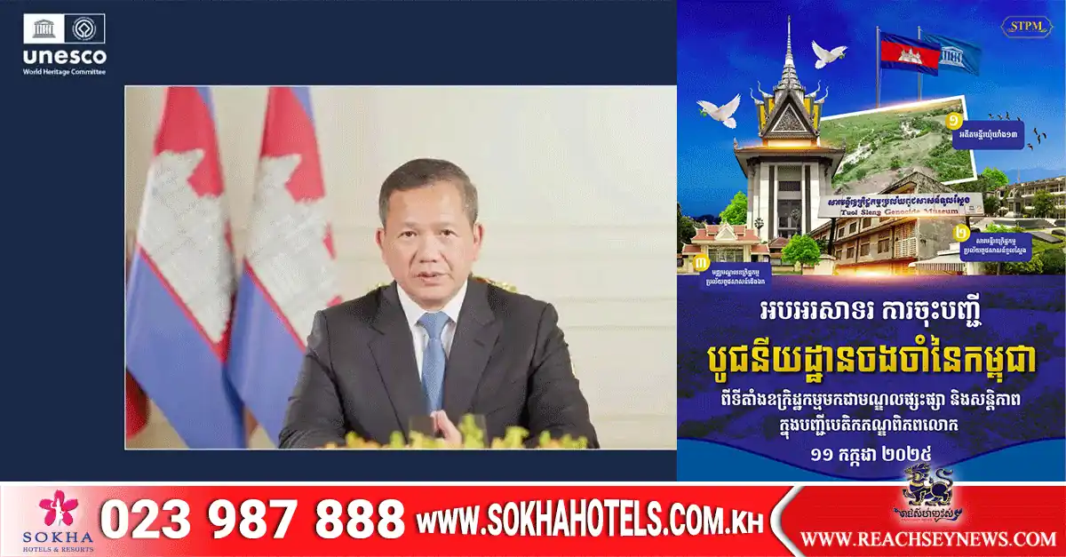 តាមរយៈសារលិខិតអបអរសាទរ ក្នុងឱកាសនៃការចុះ «បូជនីយដ្ឋានចងចាំនៃកម្ពុជា៖ ពីទីតាំងឧក្រិដ្ឋកម្មមកជា មណ្ឌលផ្សះផ្សានិងសន្តិភាព» ក្នុងបញ្ជីបេតិកភណ្ឌពិភពលោក នៅទីក្រុងប៉ារីស នៅថ្ងៃទី១១ ខែកក្កដា ឆ្នាំ២០២៥សម្តេចបវរធិបតី ហ៊ុន ម៉ាណែត បានកោតសរសើរដោយស្មោះ និងមូលវិចារណ៍ដ៏ថ្លៃថ្លាជូនចំពោះ លោកស្រី ភឿង សកុណា រដ្ឋមន្ត្រីក្រសួងវប្បធម៌ និងវិចិត្រសិល្បៈ សមាជិក សមាជិកានៃគណៈកម្មាធិការ អន្តរក្រសួង អាជ្ញាធរមូលដ្ឋាន រួមជាមួយមន្ត្រីជំនាញពាក់ព័ន្ធទាំងអស់ ដែលបានខិតខំព្យាយាមលះបង់កម្លាំងកាយ ប្រាជ្ញា និងស្មារតី ប្រកបដោយភាពប៉ិនប្រសប់និងវិជ្ជាជីវៈខ្ពស់ ពុះពារជម្នះគ្រប់ការលំបាករហូតសម្រេចបាននូវការចុះ “បូជនីយដ្ឋានចងចាំនៃកម្ពុជា៖ ពីទីតាំងឧក្រិដ្ឋកម្មមកជាមណ្ឌលផ្សះផ្សានិងសន្តិភាព” ទៅក្នុងបញ្ជីបេតិកភណ្ឌ ពិភពលោកនាពេលនេះ។