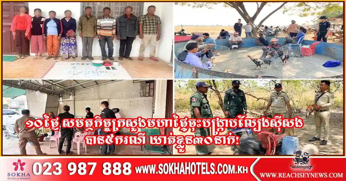 ភ្នំពេញ ៖ ១០ថ្ងៃ ពោលចាប់ពីថ្ងៃទី ២៧ ខែកក្កដា ដល់ថ្ងៃទី៥ ខែសីហា ឆ្នាំ២០២៥នេះ សមត្ថកិច្ចនៃក្រសួងមហាផ្ទៃបានបើកប្រតិបត្តិការបង្ក្រាបល្បែងស៊ីសងសរុបចំនួន ៥ករណី ឃាត់ខ្លួនអ្នកពាក់ព័ន្ធចំនួន ៣០នាក់។ ក្នុងចំណោម ៣០នាក់ដែលបានឃាត់ខ្លួន មានចំនួន ៣នាក់ ត្រូវបានបញ្ចូនទៅតុលាការ និងអប់រំណែនាំធ្វើកិច្ចសន្យាបញ្ឈប់ចំនួន ២៧នាក់។នេះបើតាមរបាយការណ៍របស់ក្រសួងមហាផ្ទៃ។