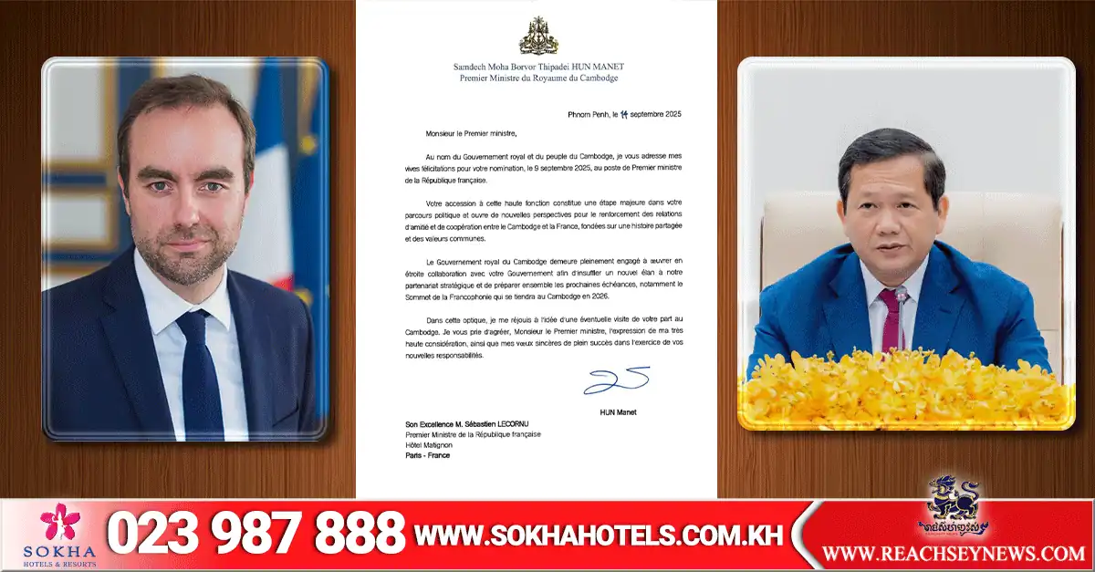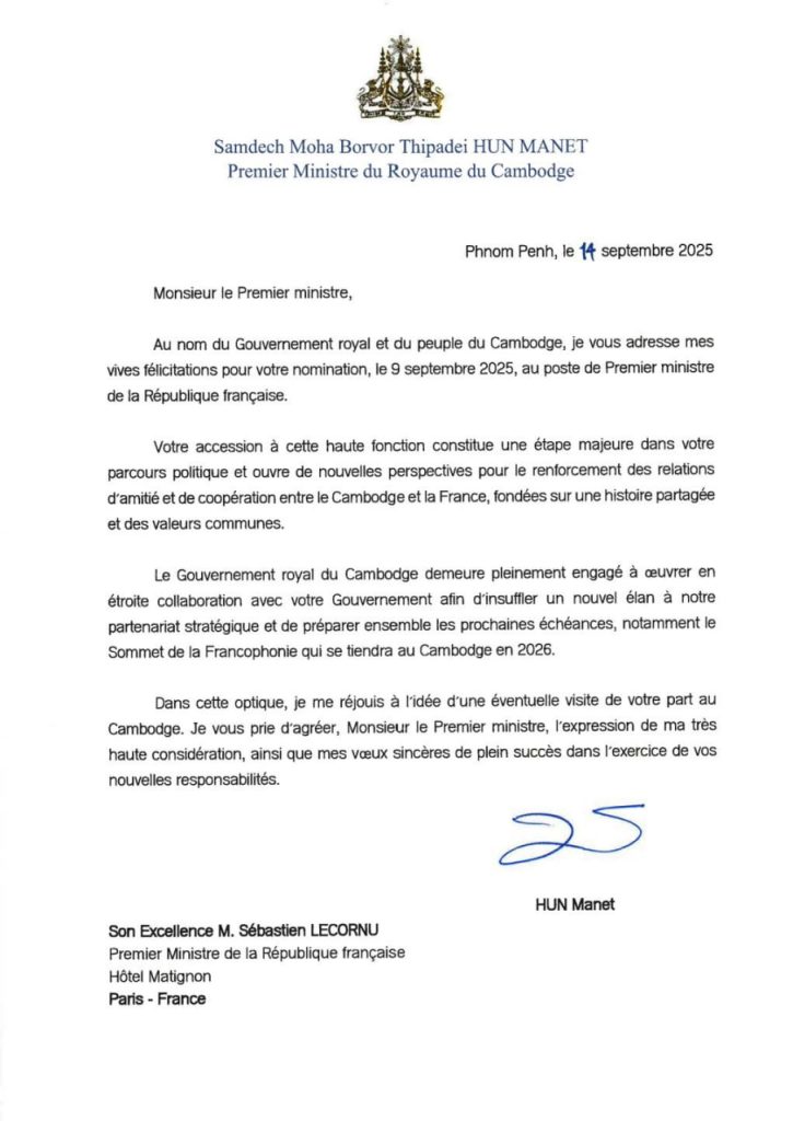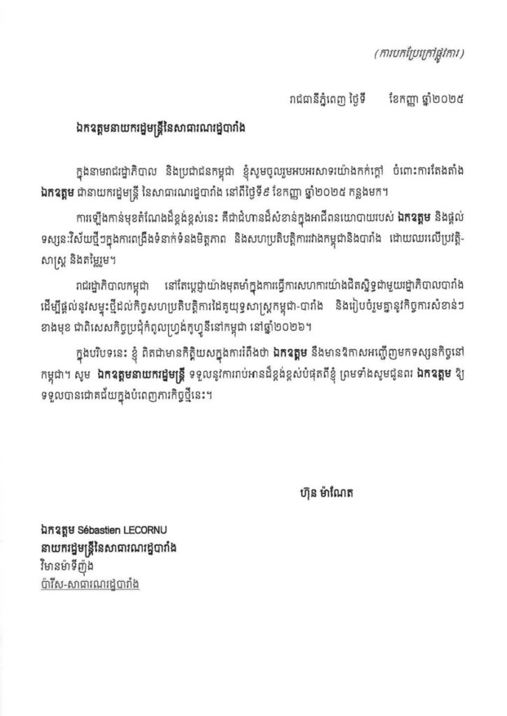 តាមរយៈសារលិខិតអបអរសាទរជូនចំពោះលោក Sébastien LECORNU ត្រូវបានតែងតាំង ជានាយករដ្ឋមន្ត្រីបារាំង, សម្តេចមហាបវរធិបតី ហ៊ុន ម៉ាណែត នាយករដ្ឋមន្ត្រីនៃកម្ពុជា បានបញ្ជាក់ថា «ក្នុងនាមរាជរដ្ឋាភិបាល និងប្រជាជនកម្ពុជា ខ្ញុំសូមចូលរួមអបអរសាទរយ៉ាងកក់ក្តៅ ចំពោះការតែងតាំង លោក ជានាយករដ្ឋមន្ត្រីបារាំង នៅថ្ងៃទី៩ ខែកញ្ញា ឆ្នាំ២០២៥ កន្លងមក»។