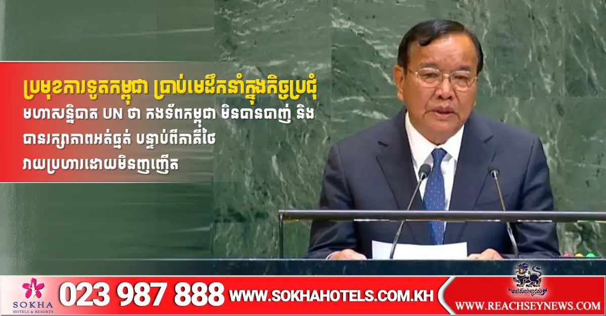 ភ្នំពេញ ៖ ក្នុងមហាសន្និបាតអង្គការសហប្រជាជាតិ (UN) លោកនាយករដ្ឋមន្ត្រី ប្រាក់ សុខុន រដ្ឋមន្ត្រីក្រសួងការបរទេស និងសហប្រតិបត្តិការអន្តរជាតិកម្ពុជា បានលើកឡើងថា កងទ័ពកម្ពុជា មិនបានបាញ់ និងបានរក្សាភាពអត់ធ្មត់ ដើម្បីបញ្ជាក់ពីការប្តេជ្ញាចិត្តដ៏មោះមុតចំពោះសន្តិភាព បន្ទាប់ពីភាគីថៃ វាយប្រហារមួយកន្លែងដោយមិនញញើត នៅជិតទីតាំងដ៏រសើប កាលពីព្រឹកថ្ងៃទី២៧ ខែកញ្ញា ឆ្នាំ២០២៥។