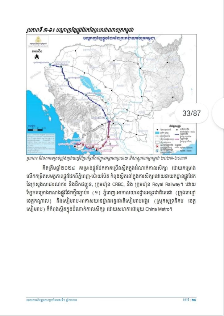 ក្នុងរបាយការណ៍នេះ បានបញ្ជាក់ទៀតថា «ការអភិវឌ្ឍផ្លូវដែកផ្តោតលើការស្តារ និងលើកកម្ពស់ផ្លូវដែកបច្ចុប្បន្ន (ភាគខាងជើង និងភាគខាងត្បូង) ទៅជាផ្លូវដែកល្បឿនលឿន ព្រមទាំងគិតគូរផ្លូវថ្មី (គន្លង និងខ្សែរថភ្លើងថ្មី)។ គម្រោងដឹកជញ្ជូនផ្លូវដែកសរុបមានចំនួន ៨គម្រោង ដែលគ្រោងនឹងចំណាយថវិកាសរុបចំនួន ១០ ០១០លានដុល្លារ អាម៉េរិក ដែលក្នុងនោះ មានគម្រោងរយៈពេលខ្លី និងមធ្យមចំនួន ៤គម្រោង (២០២៣-២០២៧) ស្មើនឹងទឹកប្រាក់ ៣ ៨០០លានដុល្លារអាម៉េរិក និងគម្រោងរយៈពេលវែងចំនួន ៤គម្រោង (២០២៨-២០៣៣) ស្មើនឹងទឹកប្រាក់ ៦ ២១០លានដុល្លារអាម៉េរិក»។