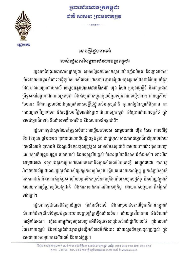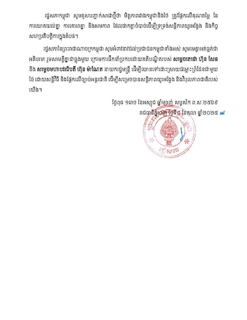 យើងខ្ញុំ សូមវាយតម្លៃខ្ពស់ចំពោះការបញ្ចេញមតិកាលពីថ្ងៃទី៦ ខែតុលា ឆ្នាំ២០២៥ របស់ សម្តេចតេជោ ហ៊ុន សែន ប្រកបដោយភាពឈ្លាសវៃ អត់ធ្មត់ និងក្នុងស្មារតីជារដ្ឋបុរស ដោយបានឆ្លុះបញ្ចាំងពីភាពជាអ្នកដឹកនាំប្រកបដោយសីលធម៌ និងស្មារតីទទួលខុសត្រូវខ្ពស់។