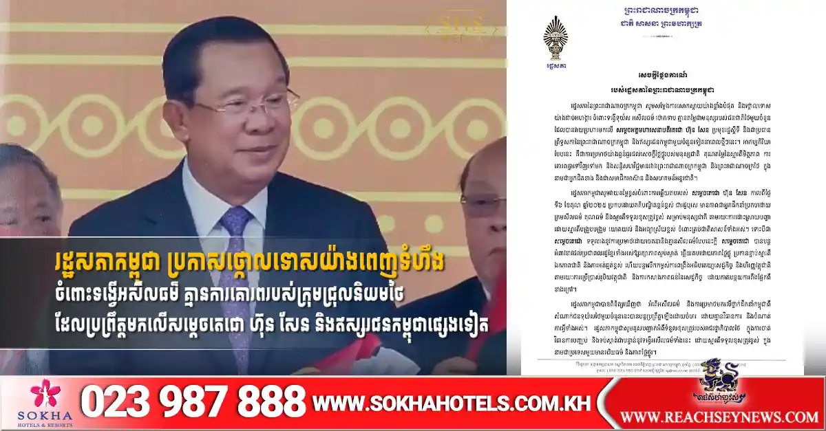 រដ្ឋសភានៃព្រះរាជាណាចក្រកម្ពុជា សូមសម្ដែងនូវការសោកស្តាយជាពន់ពេក និងសូមប្រកាសថ្កោលទោសយ៉ាងខ្លាំងក្លាបំផុត ចំពោះទង្វើវាយប្រហារ និងគ្មានការគោរពប្រព្រឹត្តមកលើ សម្តេចតេជោ ហ៊ុន សែន ប្រធានព្រឹទ្ធសភា និងឥស្សរជនកម្ពុជាផ្សេងទៀតនាពេលថ្មីៗនេះ។