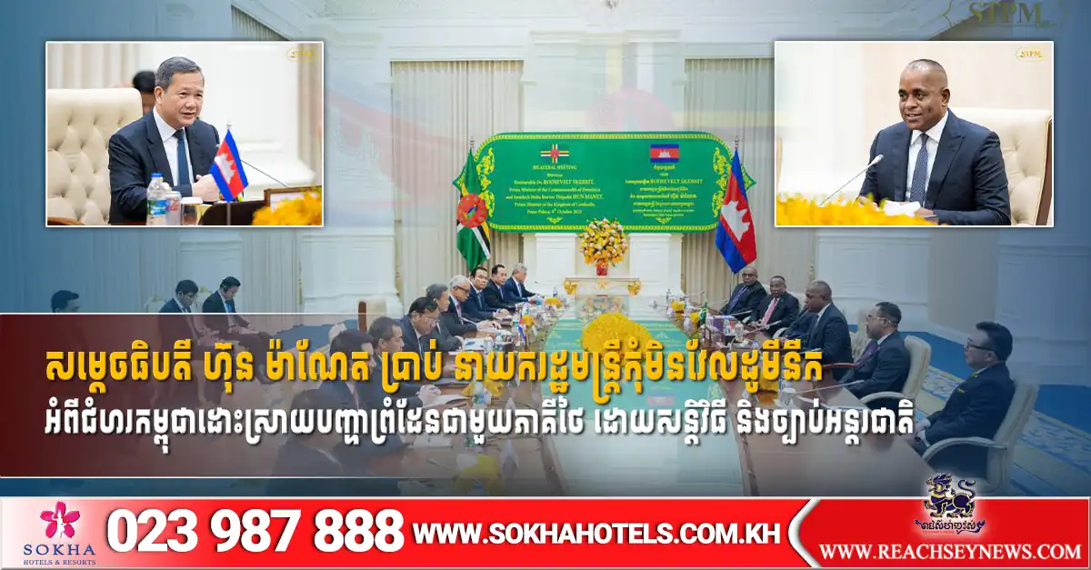 ភ្នំពេញ ៖ សម្តេចមហាបវរធិបតី ហ៊ុន ម៉ាណែត នាយករដ្ឋមន្ត្រីនៃកម្ពុជា បានថ្លែងប្រាប់នាយករដ្ឋមន្ត្រីនៃកុំមិនវែលដូមីនីក ថា ជំហររបស់កម្ពុជា ក្នុងការដោះស្រាយបញ្ហាព្រំដែនជាមួយភាគីថៃ ដោយសន្តិវិធី ផ្អែកលើកិច្ចព្រមព្រៀងទ្វេភាគី អនុសញ្ញា និង សន្ធិសញ្ញាដែលស្រាប់ និងច្បាប់អន្តរជាតិ។