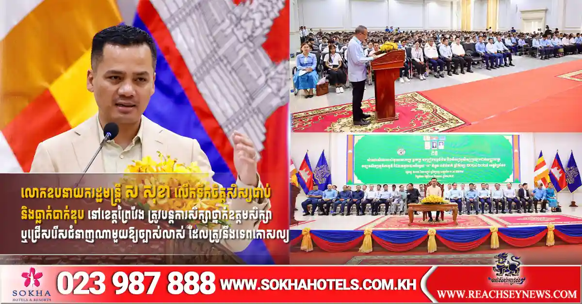ព្រៃវែង ៖ លោកឧបនាយករដ្ឋមន្ត្រី ស សុខា រដ្ឋមន្ត្រីក្រសួងមហាផ្ទៃ និងជាប្រធានក្រុមការងាររាជរដ្ឋាភិបាលចុះមូលដ្ឋានខេត្តព្រៃវែង បានលើកទឹកចិត្តដល់សិស្សានុសិស្សទាំងអស់ មិនថាសិស្សដែលជាប់និទ្ទេសA និងមិនជាប់និទ្ទេសA និងសិស្សដែលប្រឡងធ្លាក់ផងនោះ ត្រូវបន្តការសិក្សាថ្នាក់ឧត្តមសិក្សា ឬជ្រើសរើសជំនាញណាមួយឱ្យច្បាស់លាស់ ដែលត្រូវនឹងទេពកោសល្យ និងឧបនិស្ស័យរបស់ខ្លួន។
