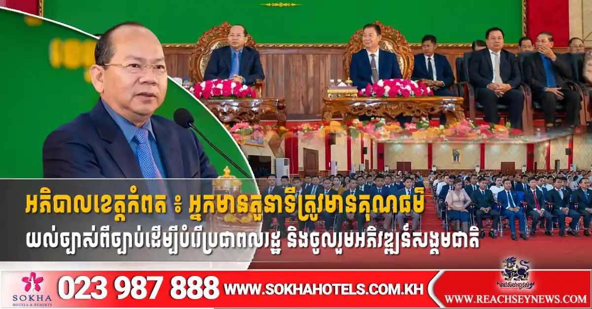កំពត ៖ លោក ម៉ៅ ធនិន អភិបាលខេត្តកំពត បានជំរុញដល់មន្ត្រីរាជការដែលទើបទទួលការតែងតាំងថ្មីគ្រប់មុខតំណែងទាំងអស់ក្នុងរដ្ឋបាលខេត្ត ស្រុក និងមន្ទីរ-អង្គភាពជុំវិញខេត្ត ត្រូវមានគុណធម៌ក្នុងការបំពេញការងារ ស្វែងយល់ឱ្យបានច្បាស់អំពីច្បាប់ លិខិតបទដ្ឋានគតិយុត្តិផ្សេងៗ ដើម្បីផ្តល់សេវាជូនពលរដ្ឋឱ្យបានល្អប្រសើរ និងចូលរួមអភិវឌ្ឍន៍សង្គមជាតិឱ្យរីកចម្រើនទៅមុខ។