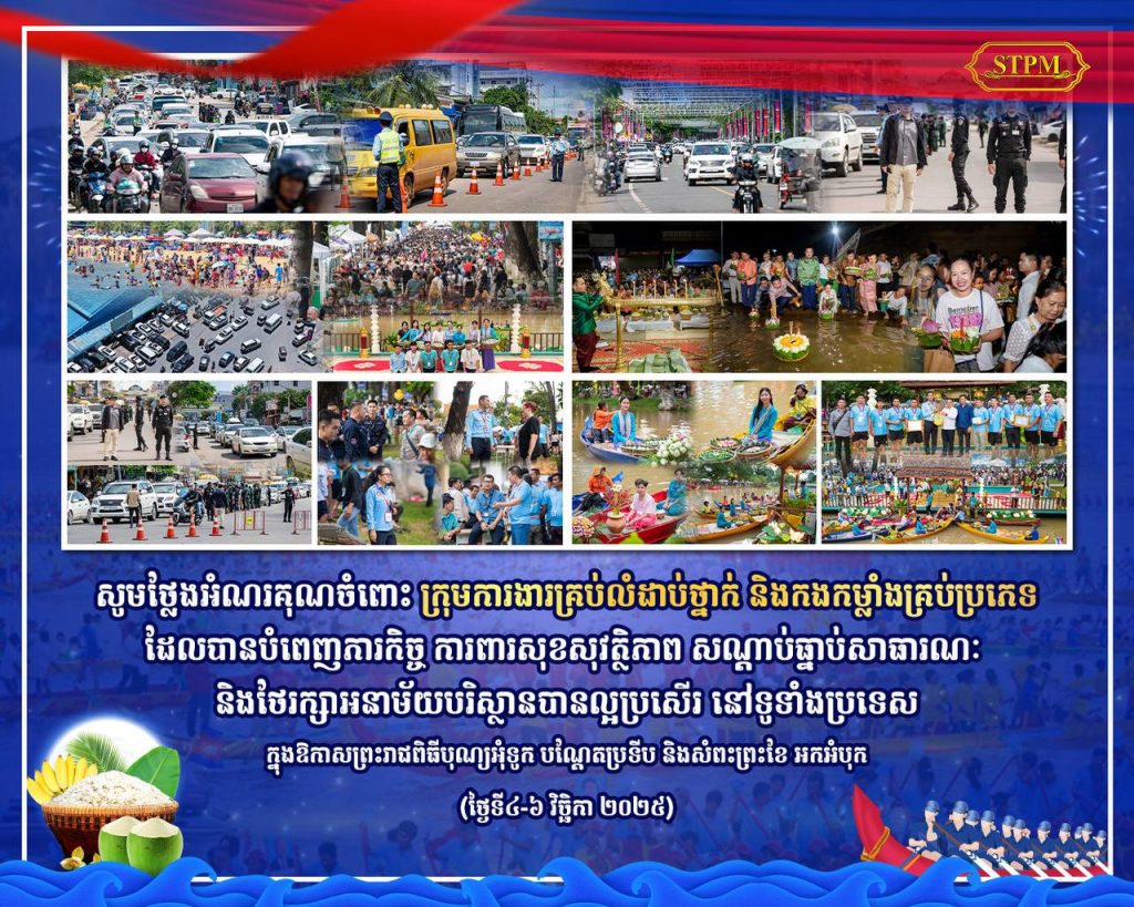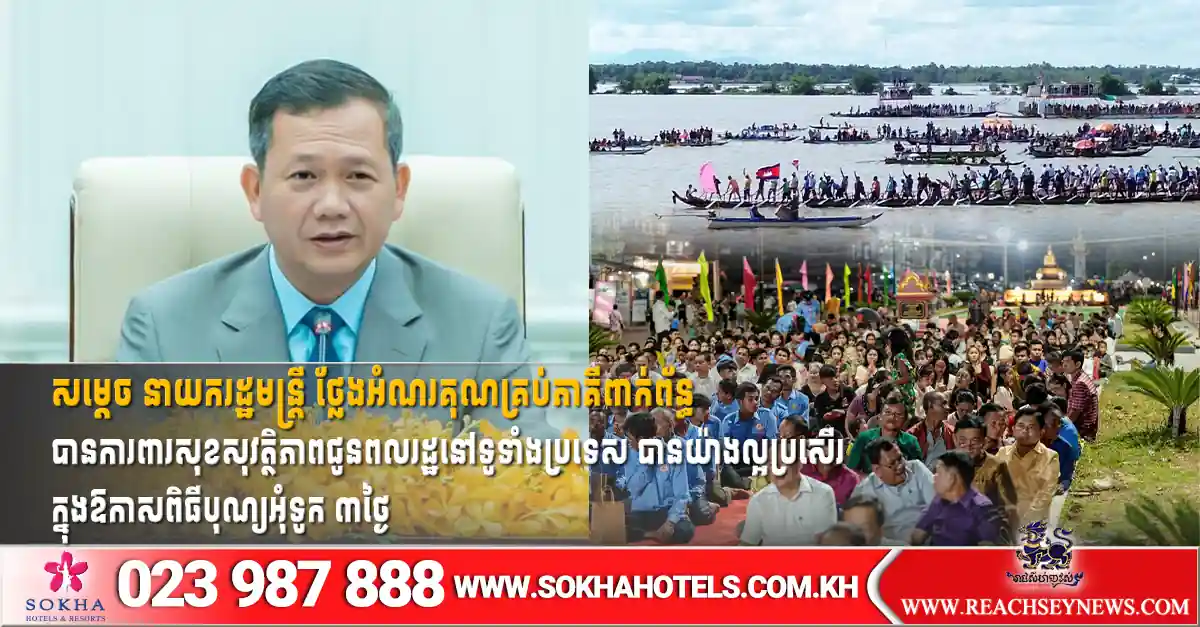 ភ្នំពេញ ៖ សម្តេចមហាបវរធិបតី ហ៊ុន ម៉ាណែត នាយករដ្ឋមន្ត្រី នៃកម្ពុជា បានថ្លែងអំណរគុណចំពោះ ក្រុមការងារគ្រប់លំដាប់ថ្នាក់ និងកងកម្លាំងគ្រប់ប្រភេទ បានបំពេញភារកិច្ច និងការពារសុខសុវត្ថិភាពជូនប្រជាពលរដ្ឋនៅទូទាំងប្រទេស បានយ៉ាងល្អប្រសើរ ក្នុងឱកាសព្រះរាជពិធីបុណ្យអុំទូក រយៈពេល ៣ថ្ងៃ។