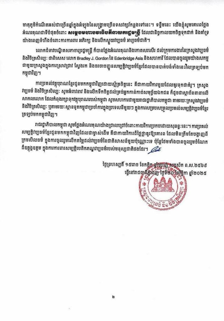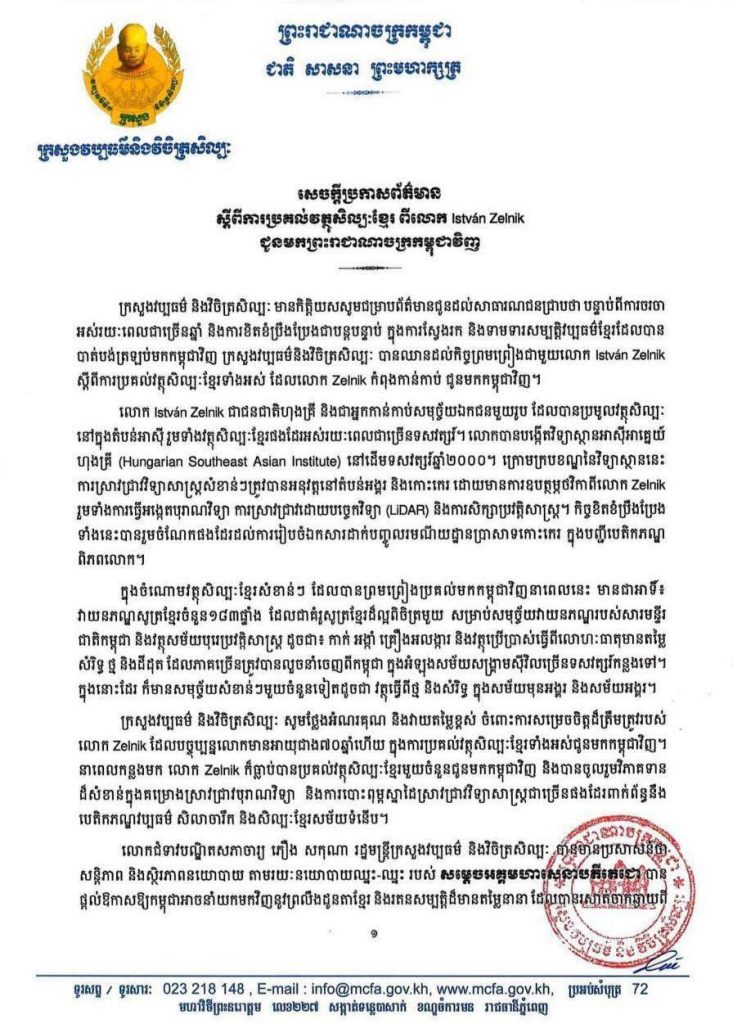 តាមរយៈបណ្ដាញសង្គម នាព្រឹកថ្ងៃទី២១ ខែវិច្ឆិកា ឆ្នាំ២០២៥នេះ សម្តេចធិបតី ហ៊ុន ម៉ាណែត បានឲ្យដឹងថា អនុវត្តតាមគោលការណ៍ដ៏ហ្មត់ចត់របស់រាជរដ្ឋាភិបាល ក្នុងនាមជាសេនាធិការផ្ទាល់ក្រសួងវប្បធម៌ និងវិចិត្រសិល្បៈ បានខិតខំប្រឹងប្រែងចរចាជាមួយលោក István Zelnik ជនជាតិហុងគ្រី និងរដ្ឋាភិបាលហុងគ្រី ដើម្បីនាំយករតនវត្ថុសិល្ប:ខ្មែរត្រឡប់មកកាន់មាតុភូមិវិញ។