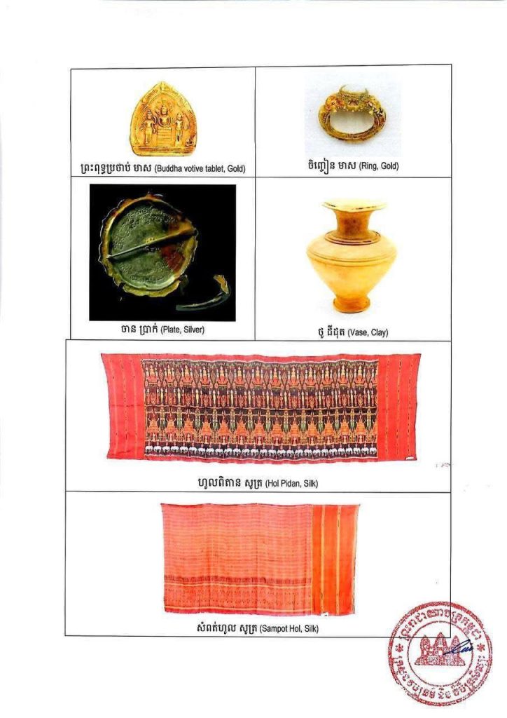 សូមបញ្ជាក់ថារតនវត្ថុសិល្បៈខ្មែរ រួមមាន៖ វាយនភណ្ឌសូត្រខ្មែរ ចំនួន ១៨៣ផ្ទាំង និងវត្ថុសម័យបុរេប្រវត្តិសាស្ត្រ ដូចជា៖ កាក់ អង្កាំ គ្រឿងអលង្ការ និងវត្ថុប្រើប្រាស់ធ្វើពីលោហធាតុមានតម្លៃ សំរិទ្ធ ថ្ម និងដីដុត ព្រមទាំងសមុច្ច័យសំខាន់ៗ ដូចជា៖ វត្ថុធ្វើអំពីថ្ម និងសំរិទ្ធ ក្នុងសម័យមុនអង្គរ និងសម័យអង្គរ គឺសុទ្ធសឹងជាកេរតំណែលពីបុព្វបុរសខ្មែរសម្រាប់កូនចៅជំនាន់ក្រោយ ដោយប្រៀបបាននឹងការវិលត្រឡប់នូវព្រលឹងដូនតាខ្មែរ៕
