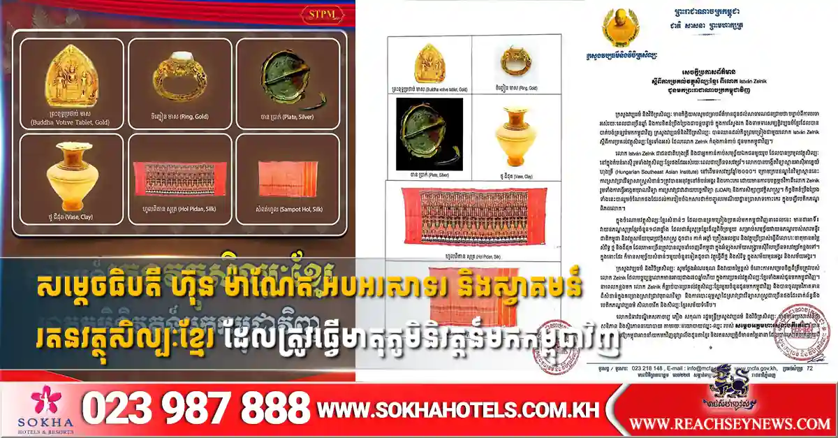 ភ្នំពេញ ៖ សម្តេចមហាបវរធិបតី ហ៊ុន ម៉ាណែត នាយករដ្ឋមន្ត្រីកម្ពុជា បានអបអរសាទរ និងស្វាគមន៍រតនវត្ថុសិល្បៈខ្មែរ ដែលត្រូវមាតុភូមិនិវត្តវិញ បន្ទាប់ពីចរចាជាមួយ លោក István Zelnik ជនជាតិហុងគ្រី និងរដ្ឋាភិបាលហុងគ្រី ដើម្បីនាំយករតនវត្ថុសិល្បៈខ្មែរត្រឡប់មកកាន់មាតុភូមិវិញ។