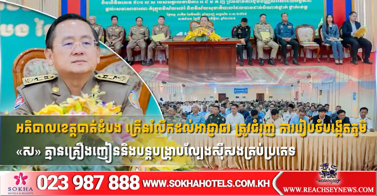 បាត់ដំបង ៖ លោក សុខ លូ អភិបាល នៃគណៈអភិបាលខេត្តបាត់ដំបង បានក្រើនរំលឹកដល់អាជ្ញាធរ ក្រុង ស្រុក ឃុំ សង្កាត់ ត្រូវជំរុញការរៀបចំបង្កើតភូមិ«ស» គ្មានគ្រឿងញៀន ហើយការរៀបចំសណ្ដាប់ធ្នាប់សាធារណៈ ទប់ស្កាត់ការរំលោភដីចំណីផ្លូវ និងបង្រ្កាបល្បែងស៊ីសងគ្រប់ប្រភេទនៅតាមមូលដ្ឋាន។
