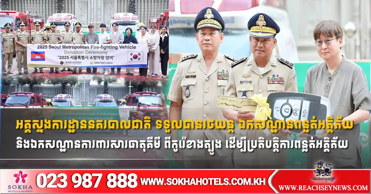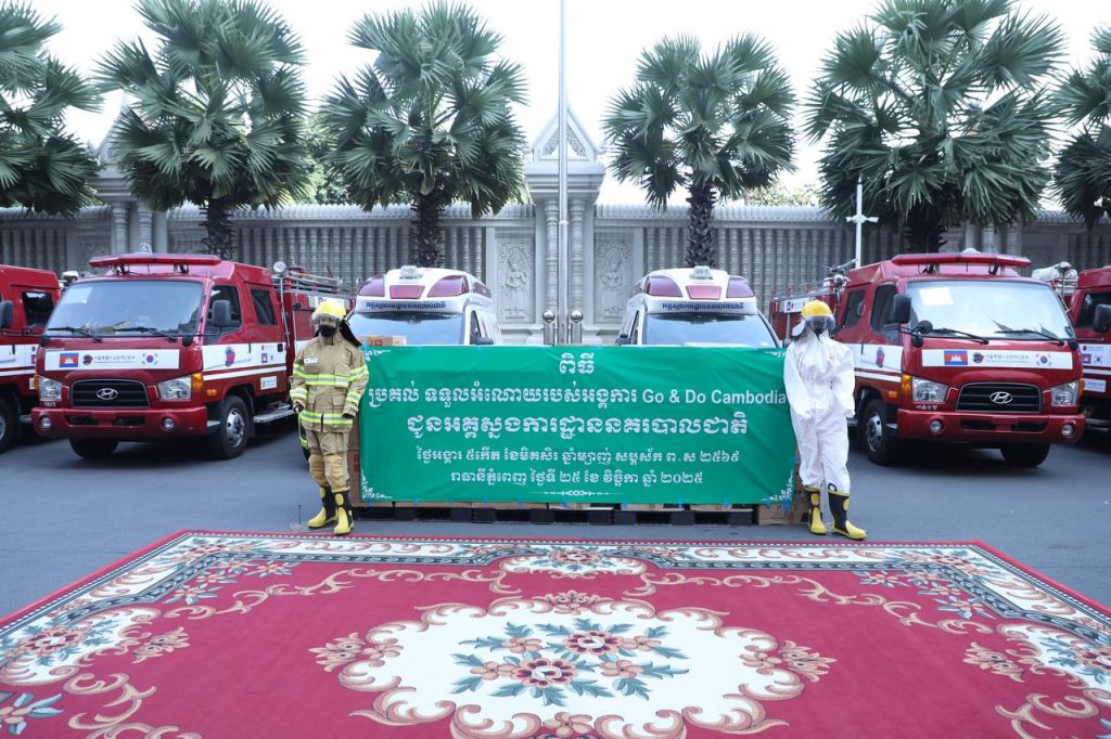 ភ្នំពេញ ៖ អគ្គស្នងការដ្ឋាននគរបាលជាតិ ទទួលបានរថយន្តពន្លត់អគ្គិភ័យ ចំនួន៥គ្រឿង រថយន្តសង្រ្គោះបន្ទាន់ចំនួន២គ្រឿង ឯកសណ្ឋានពន្លត់អគ្គិភ័យ១០០ឈុត រួមទាំងឯកសណ្ឋានការពារសារធាតុគីមី ចំនួន២ម៉ឺនឈុត ពីរដ្ឋាភិបាល នៃសាធារណៈរដ្ឋកូរ៉េ តាមរយៈអង្គការ GO&DO (NGO) ដើម្បីចូលរួមចំណែកជាមួយ កងកម្លាំងប្រតិបត្តិការលើការងារពន្លត់អគ្គិភ័យ កាន់តែងាយស្រួលក្នុងការអនុវត្តការងារ ជួយសង្គ្រោះប្រជាពលរដ្ឋពេលជួបបញ្ហាអគ្គិភ័យបានទាន់ពេលវេលា ជាពិសេសការរួមចំណែកក្នុងការការពារ អាយុជីវិត ទ្រព្យសម្បត្តិ បរិស្ថាន សន្តិសុខ សណ្តាប់ធ្នាប់សាធារណៈ សុវត្ថិភាពសង្គម។