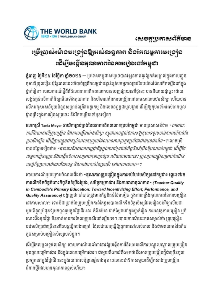 តាមរយៈសេចក្ដីប្រកាសព័ត៌មានរបស់ ធនាគារពិភពលោក (World Bank) នៅថ្ងៃទី២៥ ខែវិច្ឆិកា ឆ្នាំ២០២៥ បានឲ្យដឹងថា ប្រទេសកម្ពុជា សម្រេចបានវឌ្ឍនភាពគួរឱ្យកត់សម្គាល់ ក្នុងការបញ្ជូនកុមារឱ្យចូលរៀន ប៉ុន្តែពេលនេះចាំបាច់ត្រូវកែលម្អជាបន្ទាន់ នូវសកម្មភាពគ្រប់បែបយ៉ាងដែលកើតឡើងនៅក្នុងថ្នាក់រៀន។
