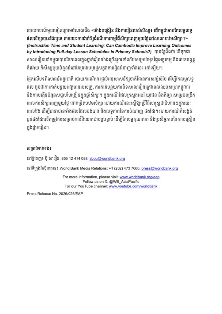 របាយការណ៍ថ្មីពីរ ដែលធនាគារពិភពលោកបានចេញផ្សាយនៅថ្ងៃទី២៥ ខែវិច្ឆិកា ឆ្នាំ២០២៥នេះ បាននិយាយដូច្នេះ ដោយសង្កត់ធ្ងន់លើការពិនិត្យមើលទាំងគុណភាព និងបរិមាណនៃការបង្រៀននៅតាមសាលាបឋមសិក្សា ហើយបានលើកអនុសាសន៍មួយចំនួនសម្រាប់ពង្រឹងអក្ខរកម្ម និងលេខនព្វន្តជាមូលដ្ឋាន ដើម្បីឱ្យកុមារទាំងអស់មានមូលដ្ឋានគ្រឹះក្នុងការរៀនសូត្រចេះ និងរីកចម្រើនទៅមុខទៀត។