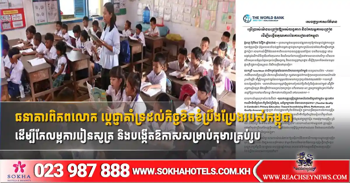 ភ្នំពេញ ៖ ធនាគារពិភពលោក បានប្តេជ្ញាចិត្តគាំទ្រដល់កិច្ចខិតខំប្រឹងប្រែងរបស់កម្ពុជា ដើម្បីកែលម្អការរៀនសូត្រ និងបង្កើតឱកាសសម្រាប់កុមារគ្រប់រូប ហើយតាមរយៈនេះត្រួសត្រាយផ្លូវសម្រាប់កំណើនសេដ្ឋកិច្ចប្រកបដោយបរិយាបន្ន។