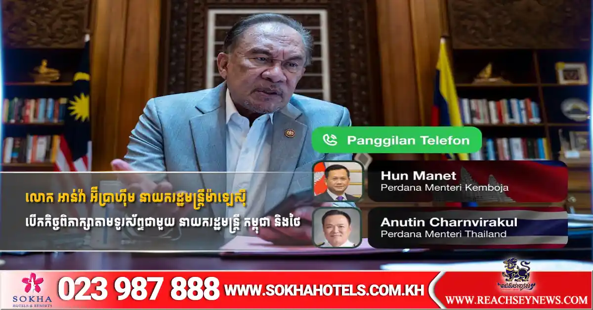 គូឡាឡាំពួ ៖ លោក អាន់វ៉ា អ៊ីប្រាហ៊ីម នាយករដ្ឋមន្ត្រីម៉ាឡេស៊ី បានបើកកិច្ចសន្ទនាតាមទូរស័ព្ទជាមួយនាយករដ្ឋមន្ត្រីកម្ពុជា និងថៃ ដើម្បីពិភាក្សាពីជម្លោះដែលកំពុងកើតឡើងនៅតំបន់ព្រំដែនរវាងប្រទេសទាំង២។