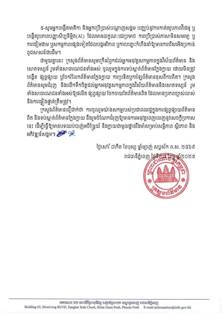 ក្រសួង បន្ថែមថា សូមចូលរួមផ្សព្វផ្សាយ និងចែករំលែកព័ត៌មានពិត ដោយផ្ទៀងផ្ទាត់ប្រភពឱ្យបានត្រឹមត្រូវ។ ចៀសវាងការបង្កើតមាតិកាដែលគ្មានមូលដ្ឋានពិតប្រាកដ ឬការអះអាងគ្មានភស្តុតាង ឬការប្រើពាក្យ ពេចន៍ ដែលអាចបង្កអន្តរាយដល់កិច្ចខិតខំប្រឹងប្រែងរបស់រាជរដ្ឋាភិបាល ឬនាំឱ្យមានផលវិបាកនានា។ ក្រសួងថា អ្នកបង្កើតមាតិកា និងអ្នកប្រើប្រាស់បណ្តាញសង្គម បញ្ឈប់នូវការកាត់តរូបភាពវីដេអូ ឬ បង្កើតរូបភាពបញ្ញាសិប្បនិម្មិត(AI) ដែលមានលក្ខណៈជេរប្រមាថ ការប្រើប្រាស់ភាសាមិនសមរម្យ ឬ ការដៀមដាម ឬសកម្មភាពផ្សេងទៀតដែលបង្កអរិភាព ឬការបញ្ឆេះកំហឹងនាំឱ្យមានការរើសអើងប្រកាន់ ពូជសាសន៍ជាដើម។