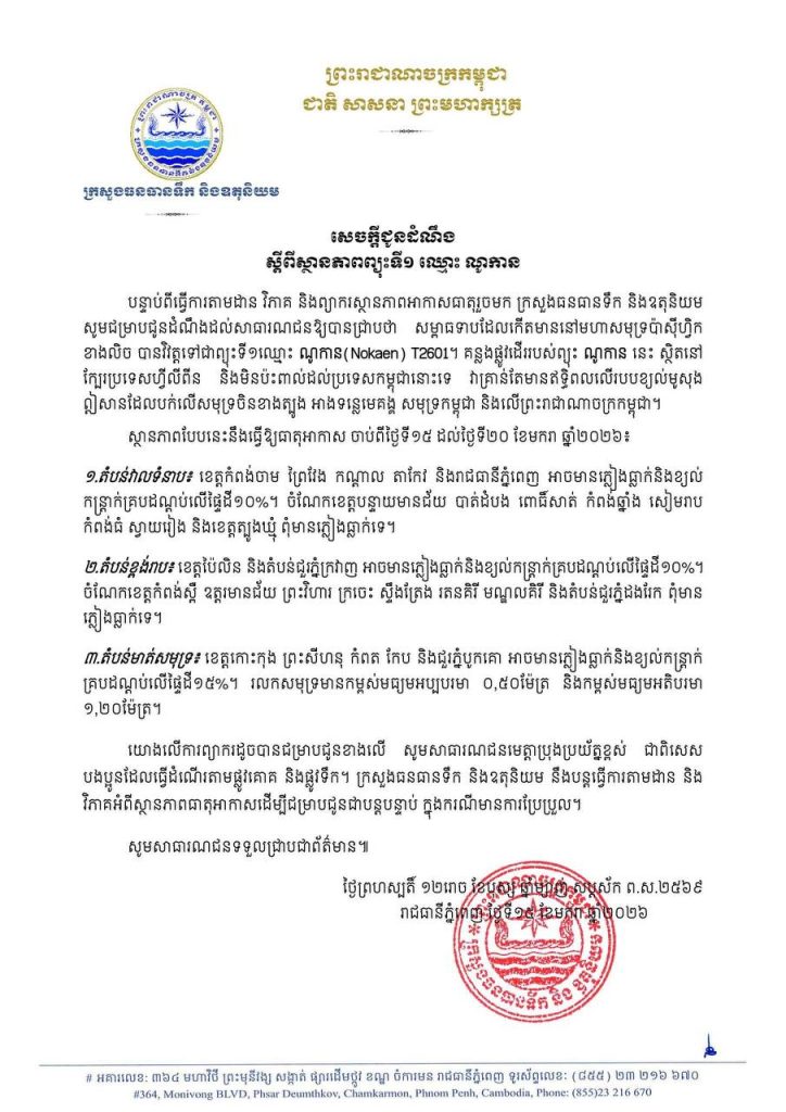 យោងតាមសេចក្ដីជូនដំណឹងរបស់ ក្រសួងធនធានទឹក នៅថ្ងៃទី១៥ មករា ថា សម្ពាធទាបដែលកើតមាននៅមហាសមុទ្រប៉ាស៊ីហ្វិកខាងលិច បានវិវត្តទៅជាព្យុះទី១ឈ្មោះ ណូកាន (Nokaen) T2601។
