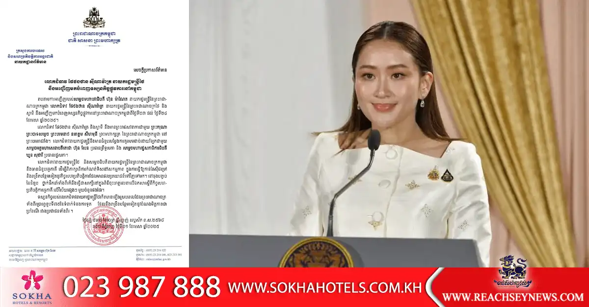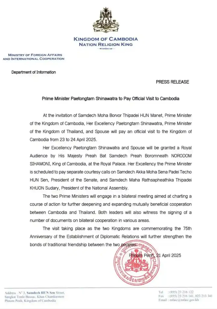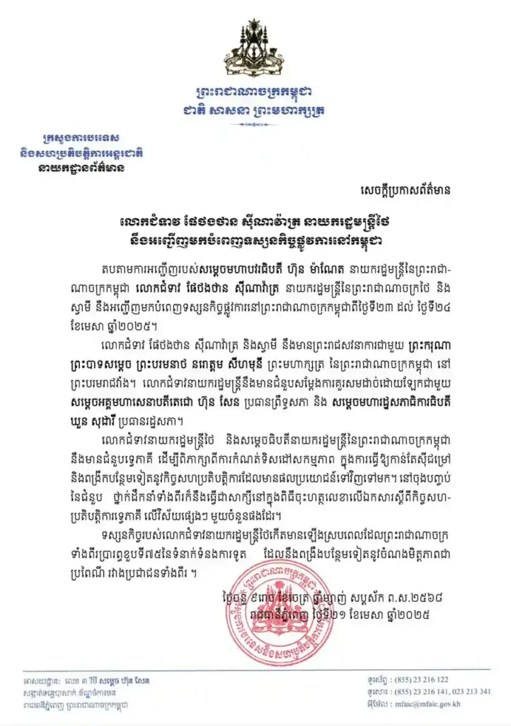 ភ្នំពេញ ៖ តបតាមការអញ្ជើញរបស់សម្តេចមហាបវរធិបតី ហ៊ុន ម៉ាណែត នាយករដ្ឋមន្ត្រី នៃព្រះរាជាណាចក្រកម្ពុជា លោកស្រី ផែថងថាន ស៊ីណាវ៉ាត្រ នាយករដ្ឋមន្ត្រីនៃព្រះរាជាណាចក្រថៃ និងស្វាមី នឹងអញ្ជើញមកបំពេញទស្សនកិច្ចផ្លូវការ នៅព្រះរាជាណាចក្រកម្ពុជា ពីថ្ងៃទី២៣ ដល់ ថ្ងៃទី២៤ ខែមេសា ឆ្នាំ២០២៥។