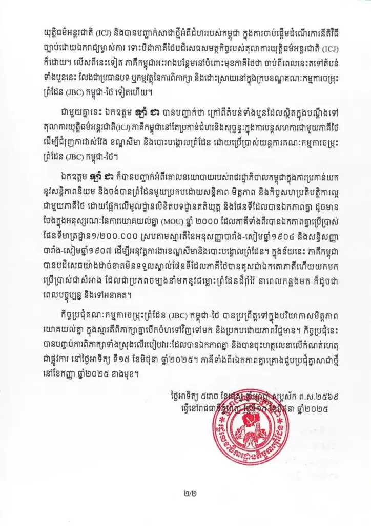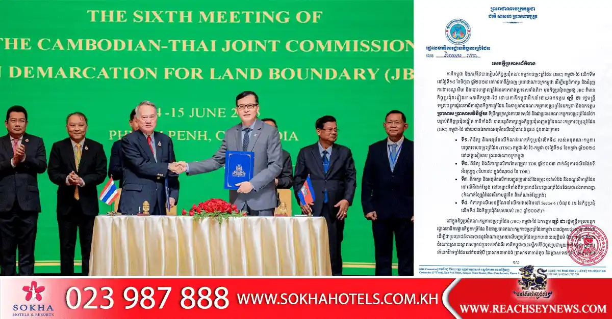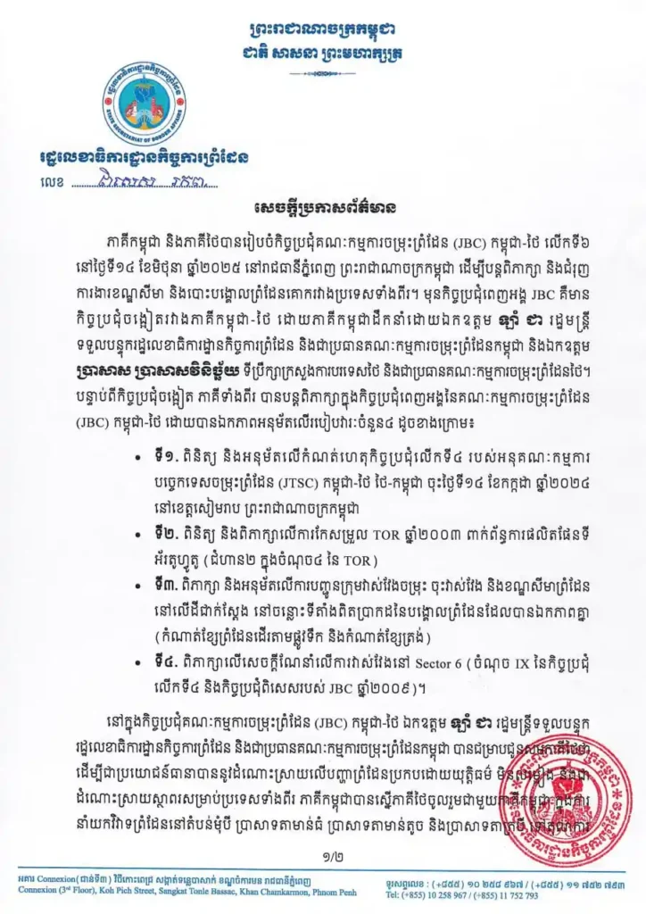 សូមបញ្ជាក់ដែរថា កិច្ចប្រជុំគណៈកម្មការចម្រុះព្រំដែន (JBC) កម្ពុជា-ថៃ បានប្រព្រឹត្តទៅក្នុងបរិយាកាសមិត្តភាព យោគយល់គ្នា ក្នុងស្មារតីពិភាក្សាគ្នាបើកចំហទៅវិញទៅមក និងប្រកបដោយភាពវិជ្ជមាន។ កិច្ចប្រជុំនេះបានបញ្ចប់ការពិភាក្សាទាំងស្រុងលើរបៀបវារៈដែលបានឯកភាពគ្នា និងបានចុះហត្ថលេខាលើកំណត់ហេតុជាផ្លូវការ នៅថ្ងៃអាទិត្យ ទី១៥ ខែមិថុនា ឆ្នាំ២០២៥។ ភាគីទាំងពីរឯកភាពគ្នាគ្រោងជួបប្រជុំគ្នាសាជាថ្មី នៅខែកញ្ញា ឆ្នាំ២០២៥ ខាងមុខ៕